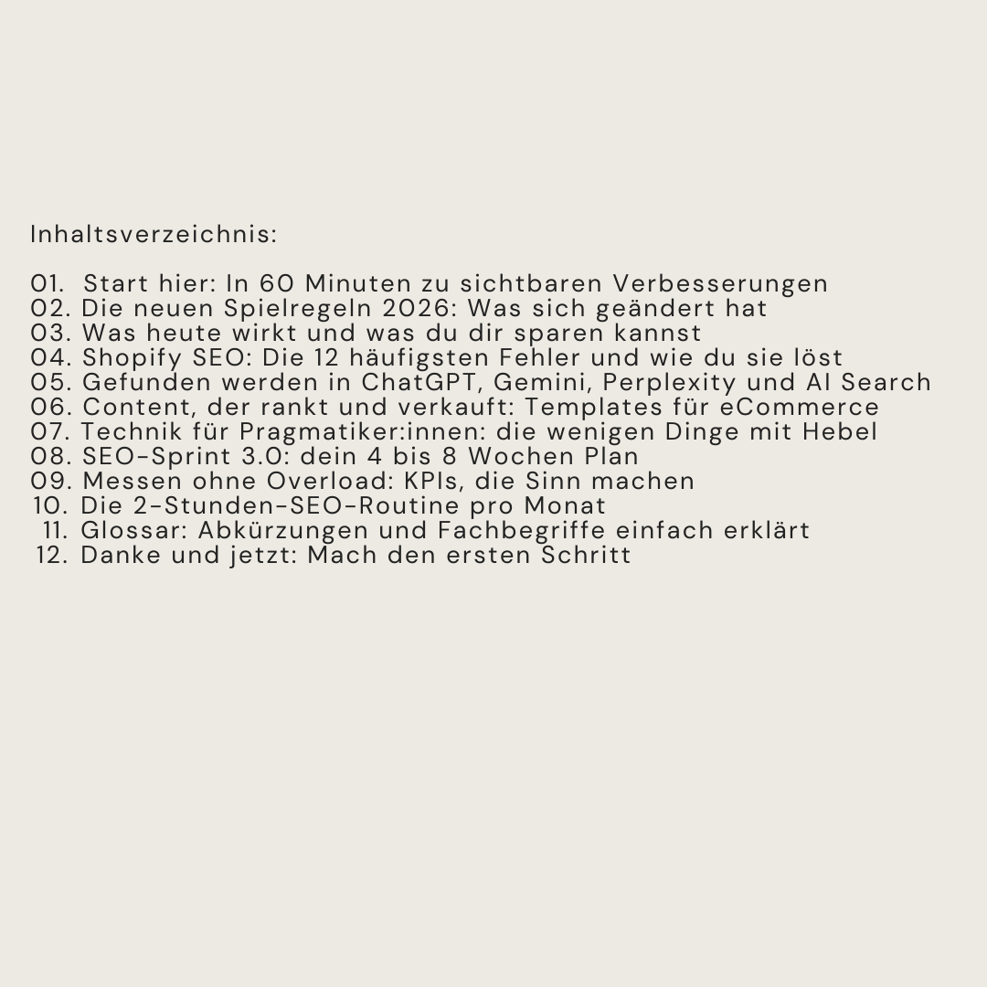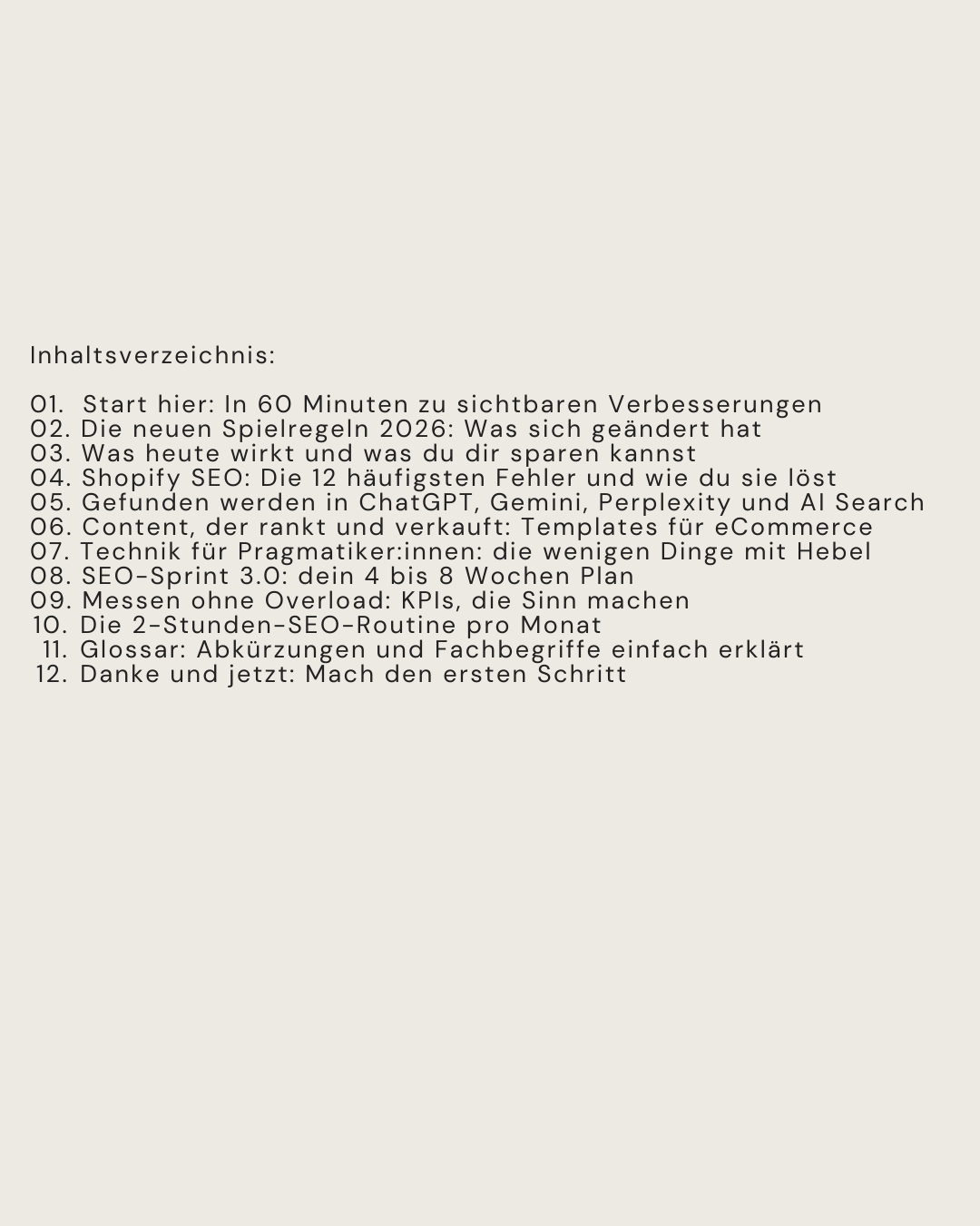 SEO funktioniert 2026. Aber anders. Dieses eBook ist ein Praxis-Guide für Shopify und eCommerce-KMU in der Schweiz. Du bekommst einen 60-Minuten-Plan für schnelle Verbesserungen, die 12 häufigsten Shopify-SEO Fehler mit Lösungen, Templates für Collection- und Produktseiten sowie einen 4–8 Wochen Sprint, den du neben dem Tagesgeschäft umsetzen kannst. Inklusive GEO-Checkliste, damit du in ChatGPT, Gemini, Perplexity und AI Overviews eher empfohlen oder zitiert wirst.